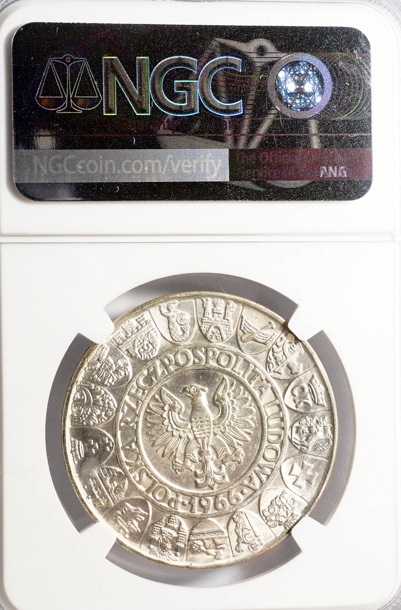 Moneta jak na zdjęciu. Grading firmy NGC- nota MS64. Srebro, waga 20,2 g. Katalog: Fischer P 187.