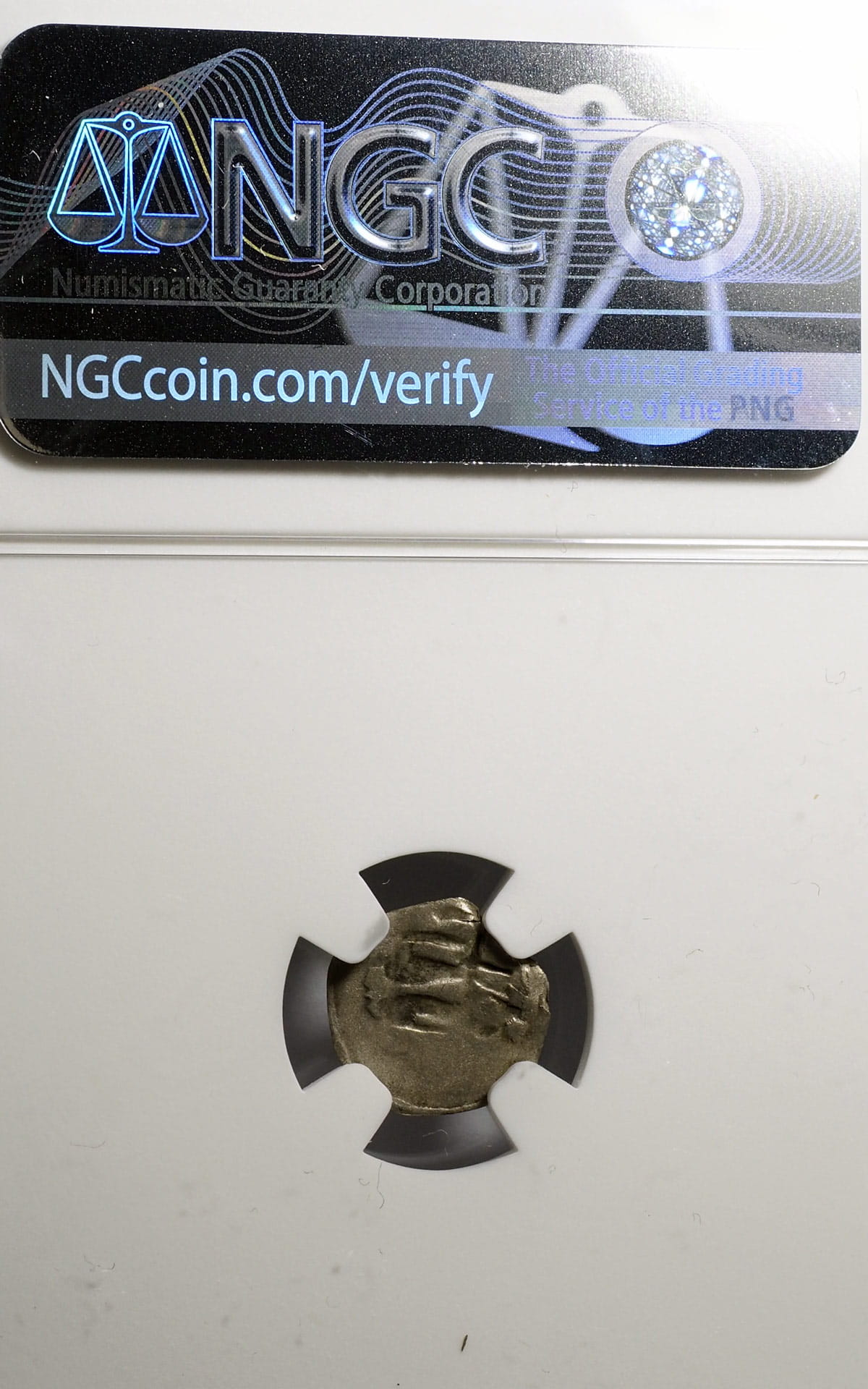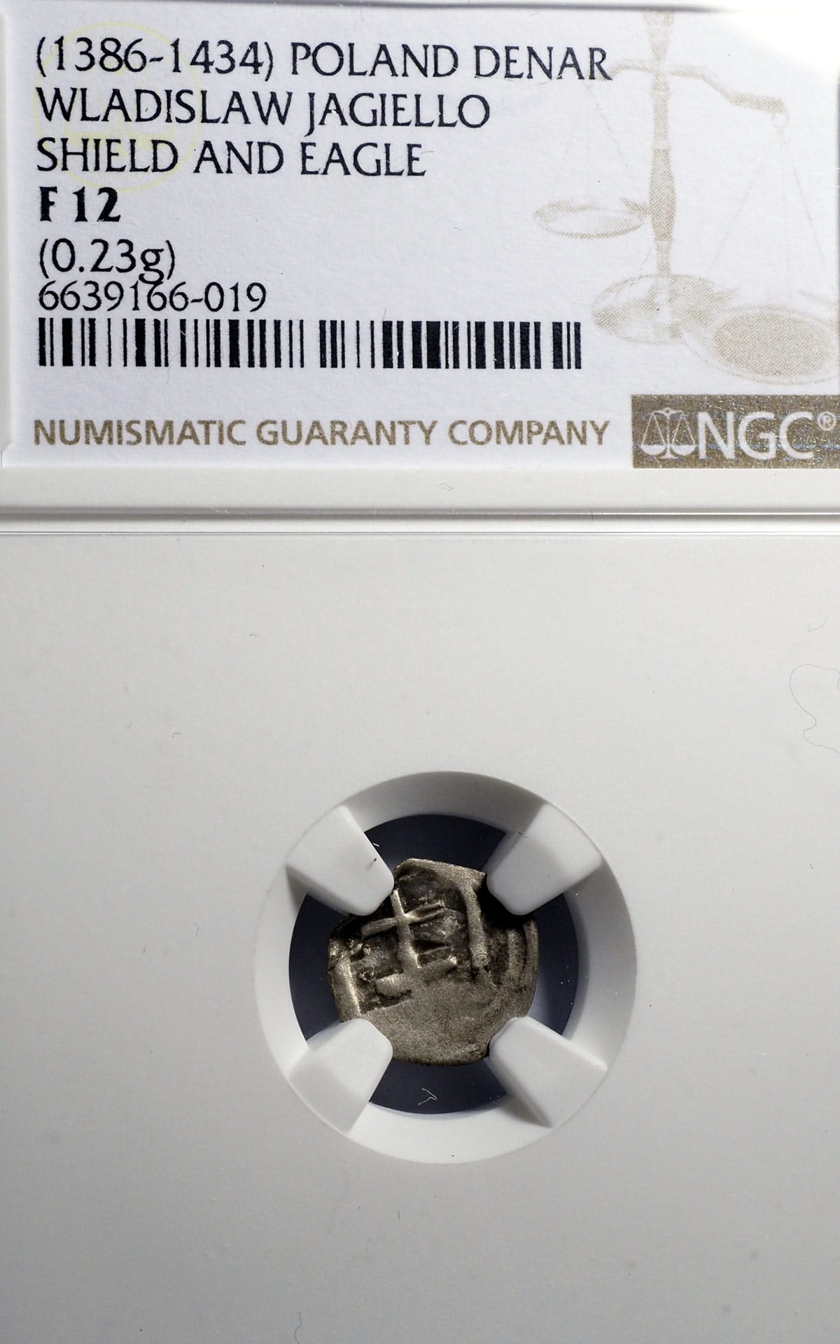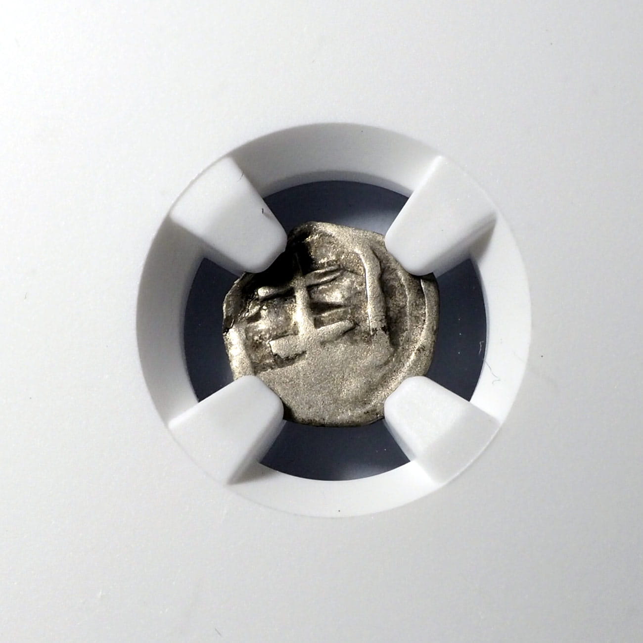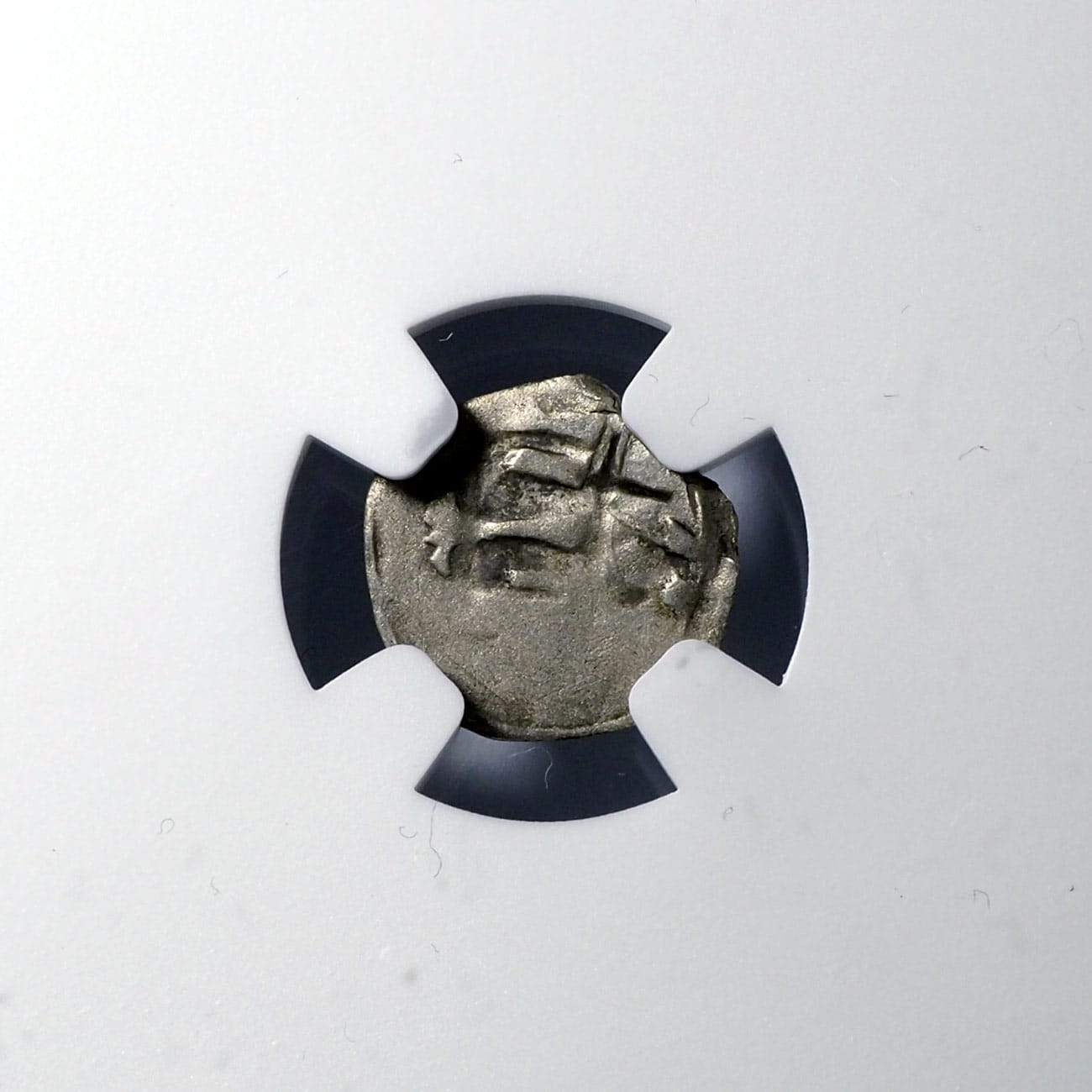 Moneta jak na zdjęciu. Obiegowy egzemplarz z dużym niedobiciem, stan III/III+, certyfikat NGC - ocena F12 - bardzo surowa. Rzadka monetka w srebrze, waga 0,23 g. Katalog: Kop 8413 R6, Gum. 431.